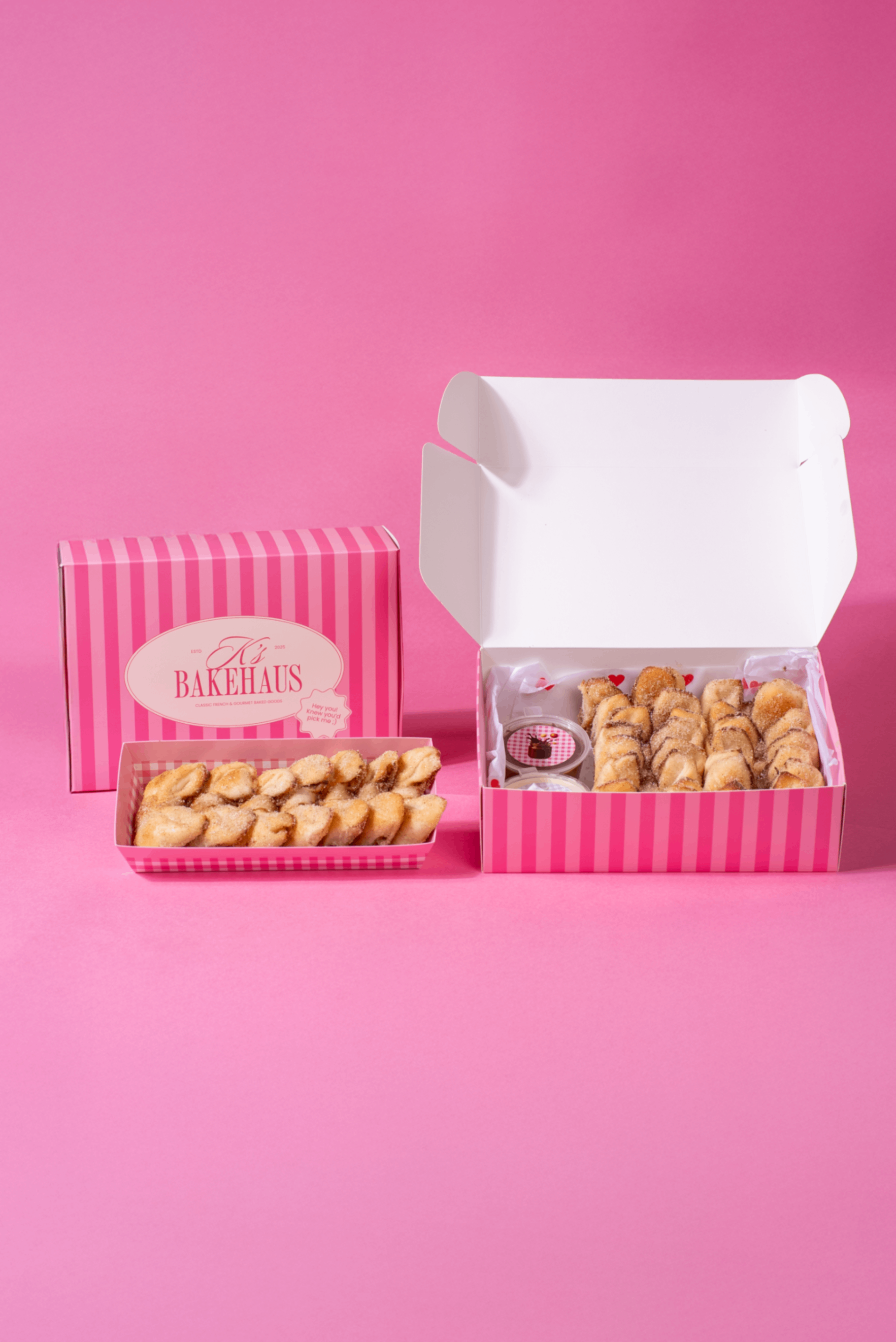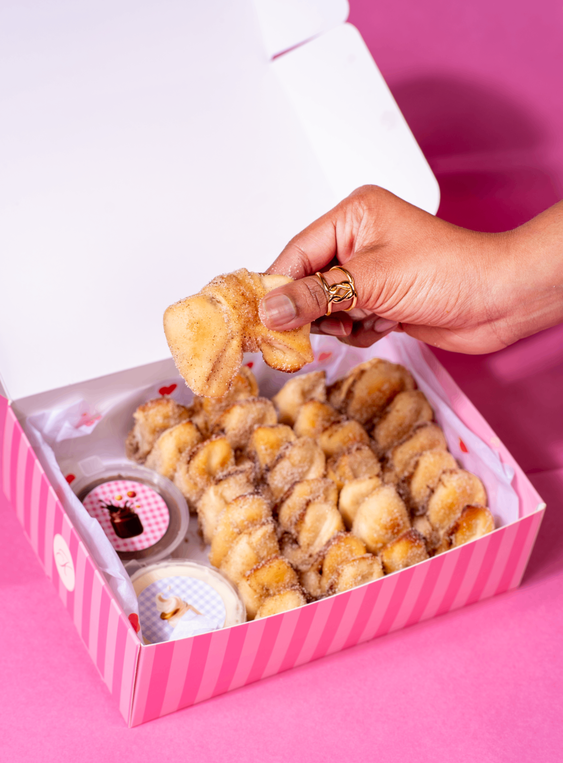 This signature treat comes as a box of 15 fluffy bows, paired with two indulgent dips – rich Nutella and smooth cream cheese